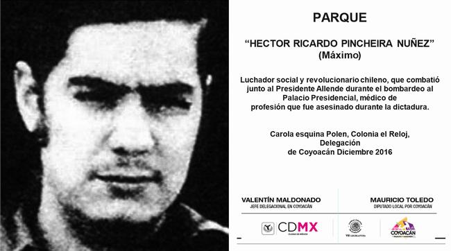 En la esquina de las calles Corola y Polen, en la Colonia El Reloj, Delegación de Coyoacán, México, se ha hecho un homenaje y dado el nombre de Héctor Ricardo Pincheira Núñez, luchador social y revolucionario chileno, que combatió con la chapa de "Máximo" junto al Presidente Allende en el palacio presidencial, La Moneda, el 11 de septiembre de 1973, al parque que allí se encuentra.
