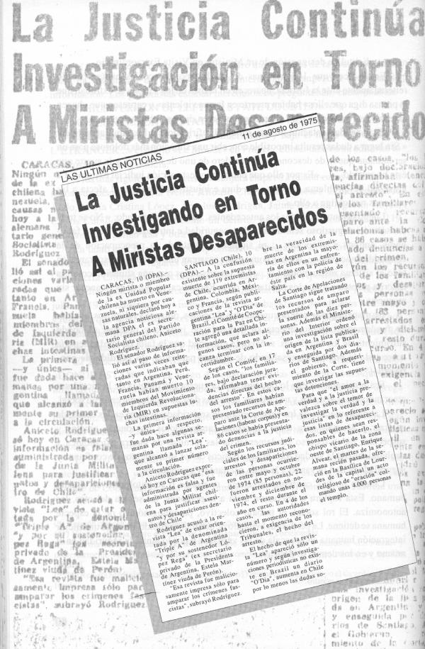 Pero al mismo tiempo agrega: � ...que algunos de los miristas supuestamente muertos en el extranjero tienen los mismos nombres de algunas de las personas que han sido objeto de recurso de amparo a causa de su desaparecimiento en nuestro país. � El Mercurio� quiere inducir una extraña coincidencia y luego de explicar lo que para él es comprensible � que combatientes extremistas hayan perdido la vida en enfrentamientos con la fuerza pública en Chile...� agrega una frase digna de reflexión...� Aunque la angustia de los familiares no se satisfaga con las incertidumbres y haya además en ciertos actores poderosas razones políticas para incentivar la desesperación de los deudos, lo humano es que se haga todo lo posible por hallar a los desaparecidos y a esto han colaborado lealmente las autoridades chilenas.�