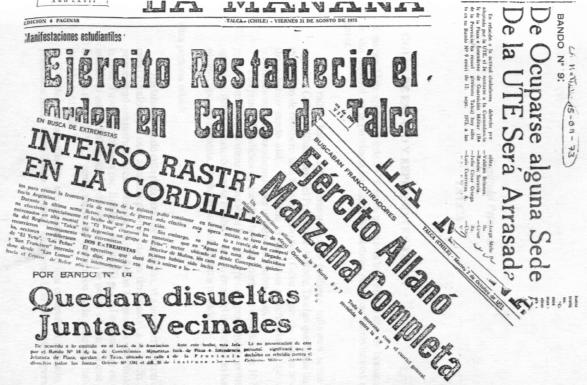 "Efectivos del Regimiento 'Talca' continúan efectuando diversos allanamientos para detectar posibles focos subversivos. En este sentido, se han allanado algunas industrias, ya que por diversas informaciones se sospecha de la existencia de armas."