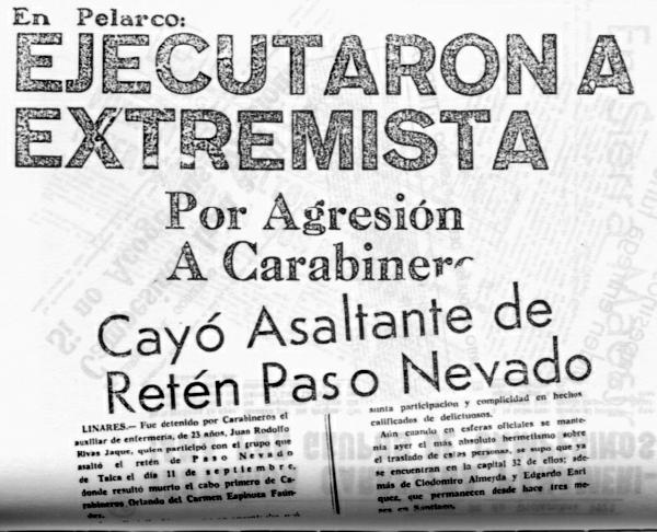 "El día del Golpe fui a Linares a tratar de juntar a la gente. Les dije que se fueran a Yerbas Buenas. El día 16 de septiembre hicimos una asamblea, los militares aún no habían llegado al campo, pero al día siguiente aparecieron. Un grupo de 17 compañeros decidimos irnos a la cordillera, por la zona de Colbún, a esperar los acontecimientos. Sólo llevábamos cajas de conservas y algunos alimentos, no teníamos armas. Arriba estuvimos hasta el 8 ó 10 de octubre: cuando vimos que nada pasaba, que la Unidad Popular había sido derrotada, decidimos volver. Algunos fuimos detenidos pocos días después."