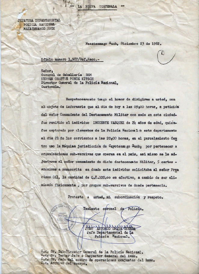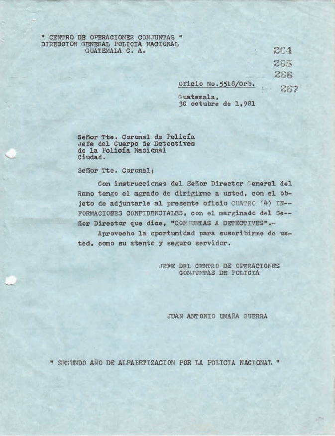 165. GT PN 51-01 S002 31.12.1981, Oficio No. 6898/Orb., por ejemplo, dirigido al jefe del Comando Seis, remite el teniente coronel de policía Juan Antonio Umaña Guerra, jefe del COCP, trasladando una información confidencial con instrucciones del Director General [Referencia digital 2770915. Registro interno AHPN 27207]. [Volver]
