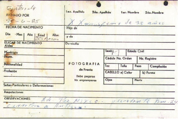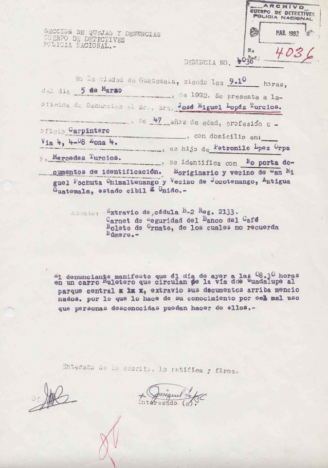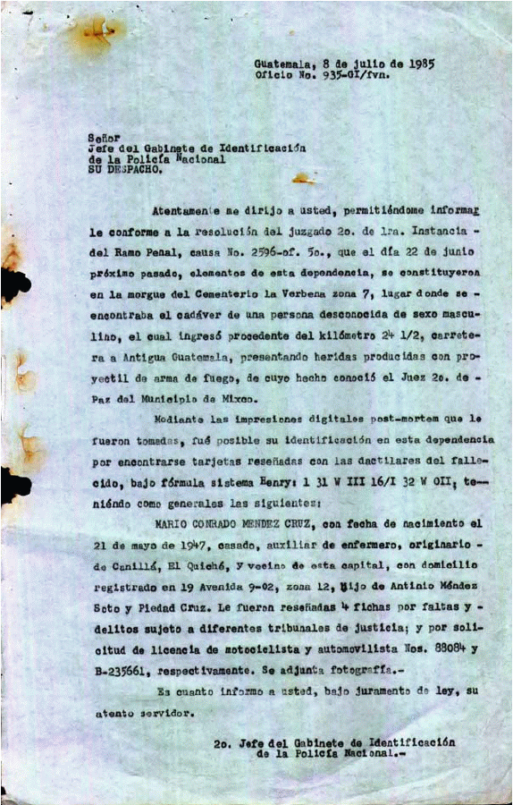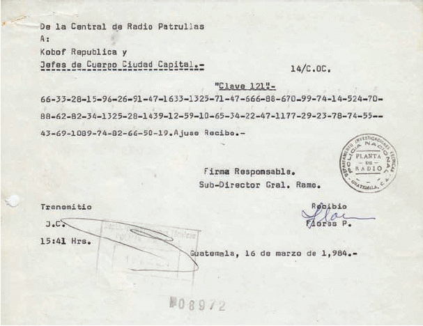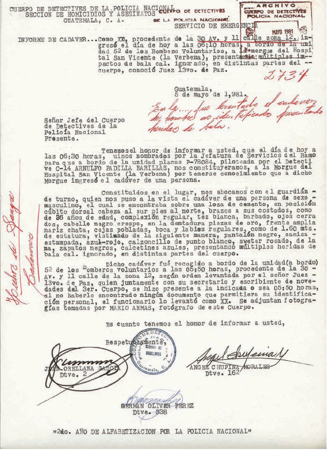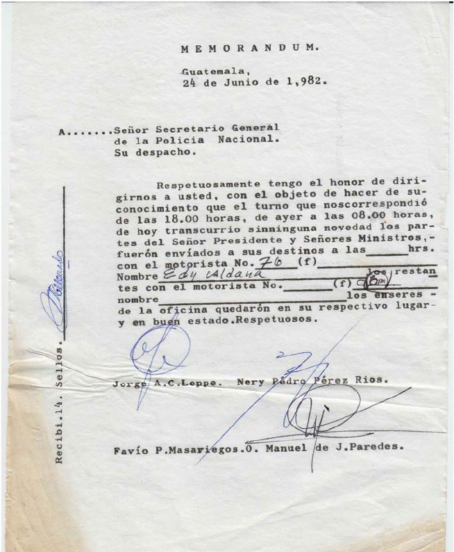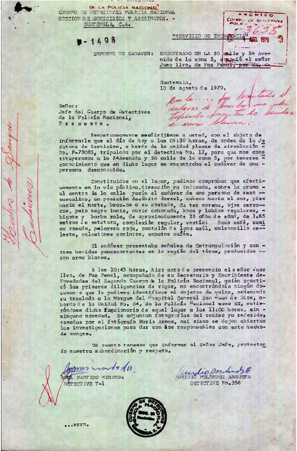 2. GT PN 51-02 S005 22.07.1982, of. No. 616/Ref/Rrz, rastreo a lo largo del Río Naranjo [Referencia digital 3157576. Registro interno AHPN 30768]. [Volver]155. Por ejemplo, GT PN 51-02 S005 18.07.1982, of. 608/Ref/Rrz, en el domicilio situado en la 3ª avenida y 36 calle de la zona 12 [Referencia digital 3156879. Registro interno AHPN 30764]. [Volver]