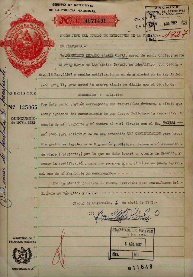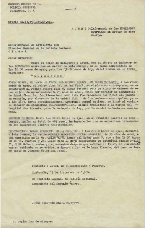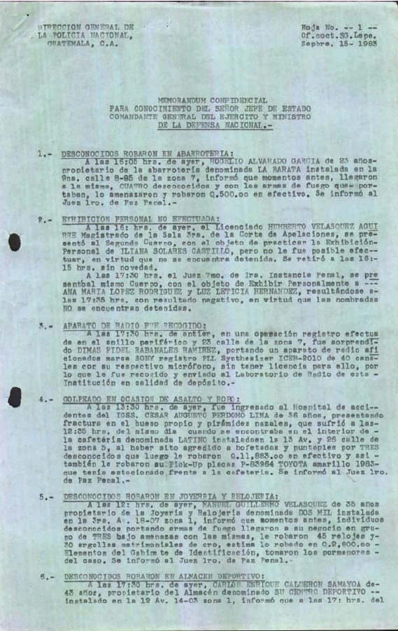 2. GT PN 51-02 S005 25.09.1983, oficio No. 3682, Ref.QC.EGG. Primer circunstanciado. Membrete COE y referencia Quinto Cuerpo –QC– [Referencia digital 3179539. Registro interno AHPN 30762]. [Volver]151. Óp. cit., GT PN 30-01 S010 27.03.1978, informe de labores de la Policía Nacional, julio 1977-marzo 1978, siendo Director General de la PN el coronel de infantería Mario Cardona Maldonado [Referencia digital 1916126. Registro interno AHPN 27472]. [Volver]
