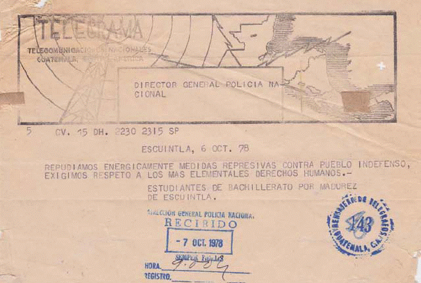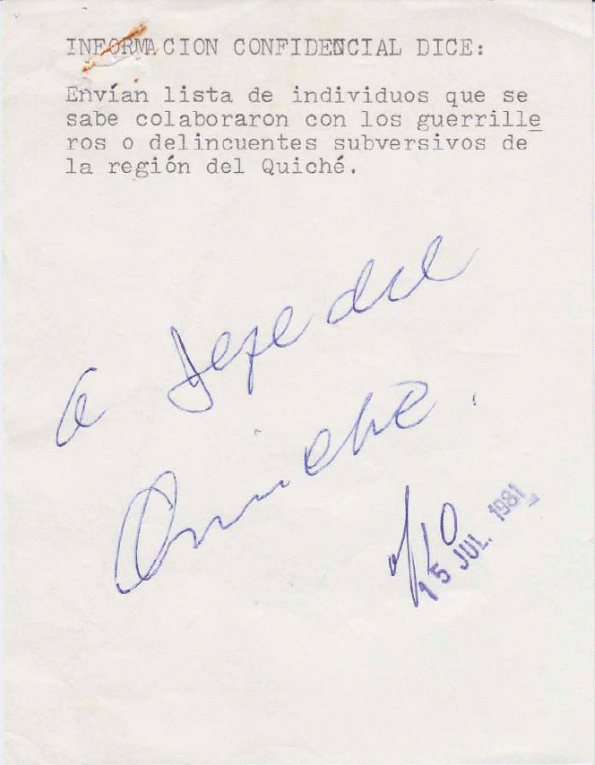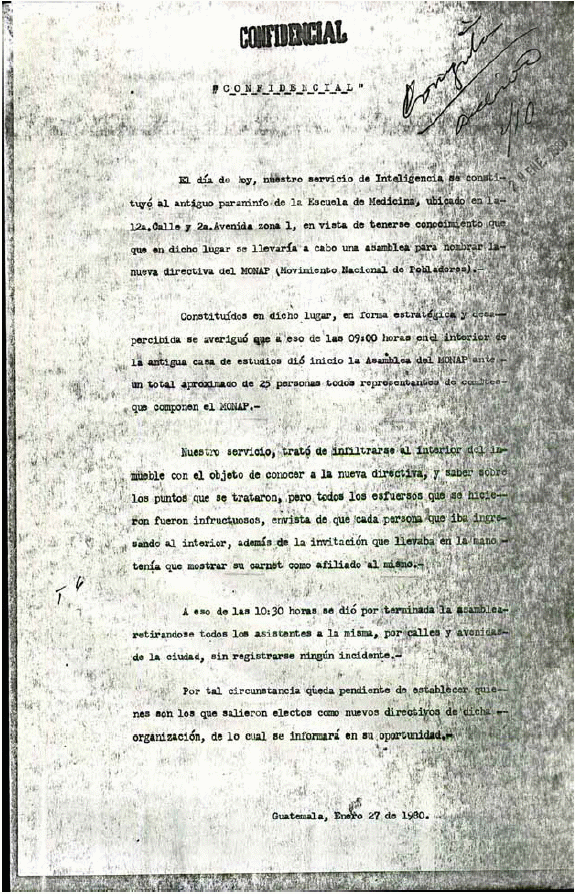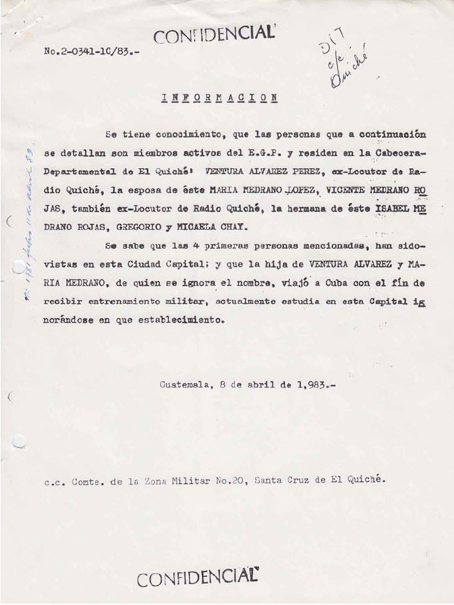 2. GT PN 51-01 S002 12.03.1984, denuncia anónima de que un cura es colaborador del Partido Guatemalteco del Trabajo (PGT) [Referencia digital 2776383. Registro interno AHPN 27503]. [Volver]187. Hasta el momento de edición de este informe, no se ha encontrado documentos en los que la tinta del sello que los marca como secreto fuera de un color distinto al rojo. [Volver]