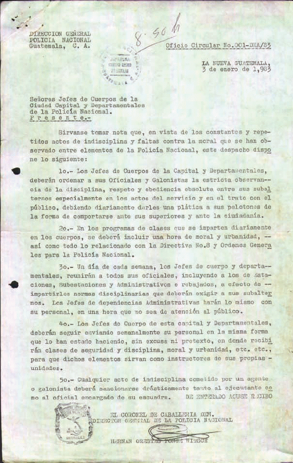 136. GT PN 30-01 S010 07.02.1983, Memoria de la Polic�a Nacional de 1982, suscrita por el Director General de la PN, coronel de caballer�a DEM Hern�n Orestes Ponce Nitsch, p�g. 3 [Referencia digital 1671494. Registro interno AHPN 27487]. [Volver]