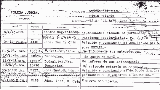 168. Óp. cit., GT PN 51-02 S008 02.01.1980, of. No.009/Ref.jadca, “Memoria de labores de la Sección de Investigaciones Especiales del Comando Seis de la Policía Nacional. Durante el período comprendido del 1ero. de enero al 31 de diciembre 1979”, siendo primer jefe del Comando Seis el teniente coronel Pedro García Arredondo [Referencia digital 2733331. Registro interno AHPN 27813]. [Volver]