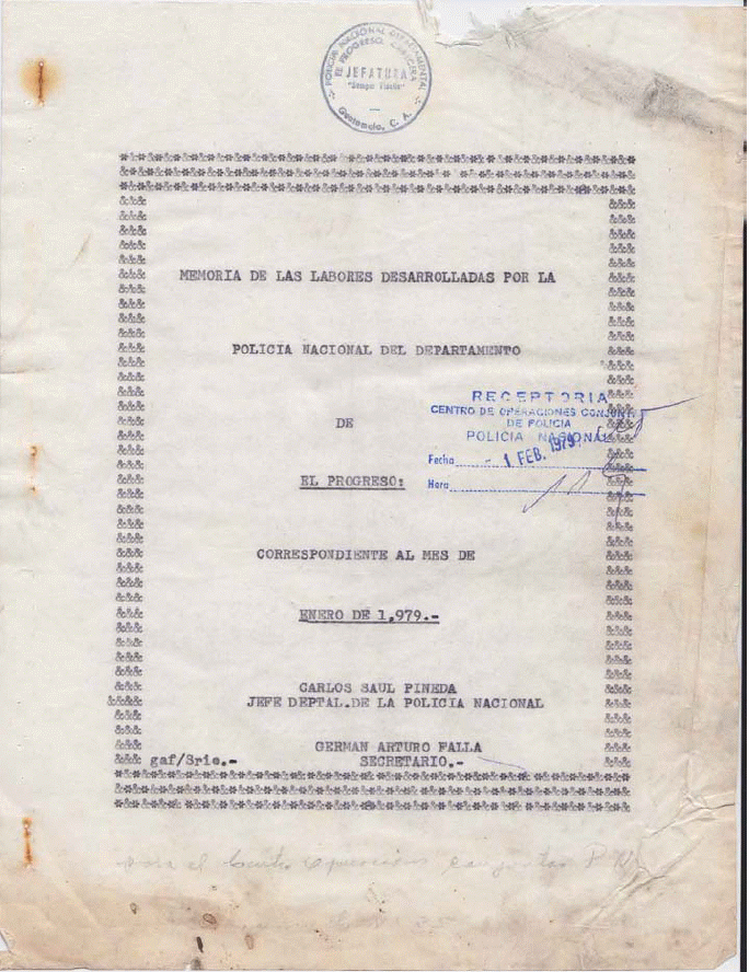 160. GT PN 51-02 S008 02.01.1980, of. No.009/Ref.jadca, “Memoria de labores de la Sección de Investigaciones Especiales del Comando Seis de la Policía Nacional. Durante el período comprendido del 1ero. de enero al 31 de diciembre 1979”, siendo primer jefe del Comando Seis el teniente coronel Pedro García Arredondo [Referencia digital 2733331. Registro interno AHPN 27813]. [Volver]