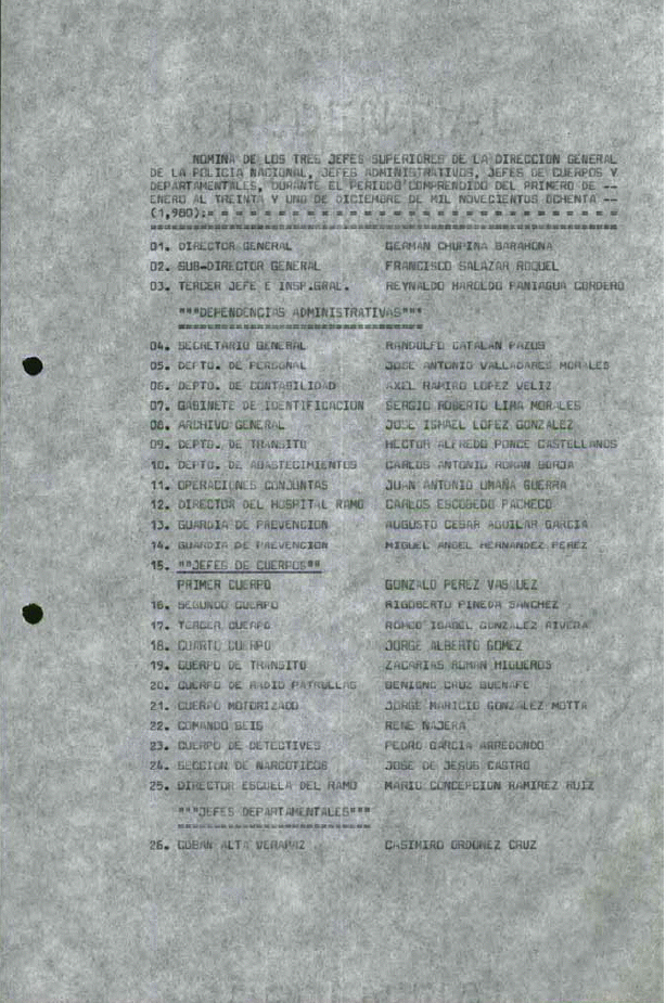 169. GT PN 30-01 S011 03.1980, “Nómina de personal que presta sus servicios en la Sección de Investigaciones Especiales del Comando Seis, con sede en el Segundo Cuerpo de la Policía Nacional…” [Referencia digital 826954. Registro interno AHPN 27183]. [Volver]