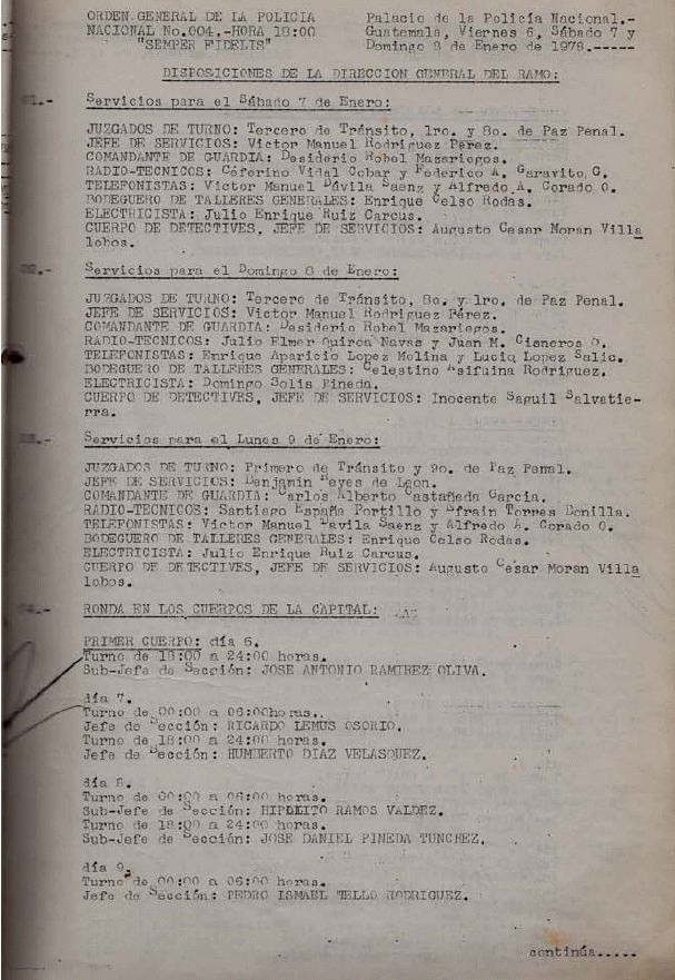 8. GT PN 30-01 S010 15.02.1982, informe de labores desarrolladas por la PN durante el año de 1981, suscrita por el Director General de la PN, coronel de infantería Germán Chupina Barahona, p. 19 [Referencia digital 1666948. Registro interno AHPN 27802]. [Volver]125. 1. GT PN 35 S001 22-24.08.1980, libro de Órdenes Generales, Orden General No. 102, reproducción del Acuerdo Gubernativo de Nombramiento No. 41, según el cual Pedro García Arredondo asumió la jefatura del Cuerpo de Detectives el 22 de agosto de 1980 en sustitución de Manuel de Jesús Valiente Téllez, número de Libro 10505 [Registro digital 742068. Registro interno AHPN 27077].