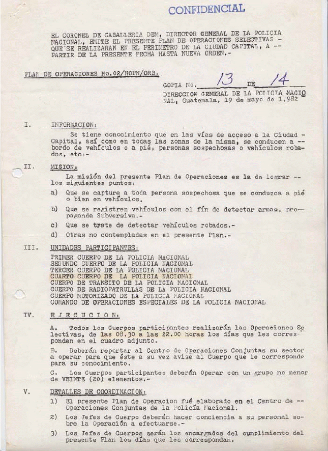 185. GT PN 26-01 S003 17.01.1984, por ejemplo, Plan de Seguridad No. 001, “El Comandante del Cuarto Cuerpo de la Policía Nacional, emite el presente plan de seguridad que norma la seguridad del edificio en caso de suscitarse alguna emergencia” [Referencia digital 46133. Registro interno AHPN 27220]. [Volver]