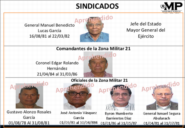 Un grupo de 18 veteranos militares, entre ellos Manuel Benedicto Lucas García, exjefe del Estado Mayor General del Ejército durante el conflicto armado interno, fueron detenidos, involucrados en dos investigaciones del MP por desapariciones forzadas y delitos contra los deberes de la humanidad.