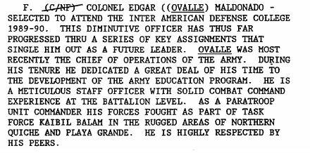 Según documentos desclasificados por Estados Unidos, Ovalle Maldonado fue oficial de operaciones de la Fuerza de Tarea Ixil durante septiembre de 1981 a septiembre de 1982.