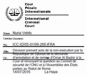 Autres La Chambre préliminaire II (� La Chambre �) de la Cour pénale mternationale (� la Cour �) prend acte de la non-exécution par la République de Djibouti (� Djibouti �) de la demande d'arrestation et de remise d'Omar Hassan Ahmad Al Bashir (� Omar Al Bashir m) à la Cour et en réfère par la présente au Conseil de sécurité de l'ONU (� le Conseil de sécurité �) et à l'Assemblée des États parties au Statut de Rome (� l'Assemblée des États parties �) en application de l'article 87-7 du Statut de Rome (� le Statut �).