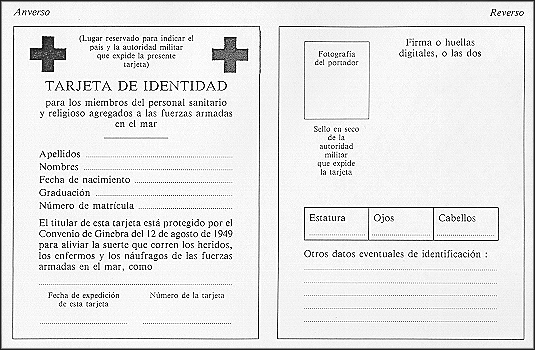 Modelo de tarjeta de identidad para los miembros del personal sanitario y religioso agregados a las fuerzas armadas en el mar.